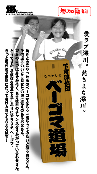 6月13日のベーゴマ道場はアサヒアートフェスティバル=深川アートセンター=の協力で行なわれます。